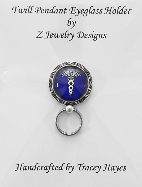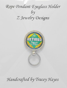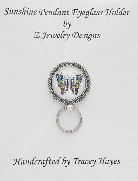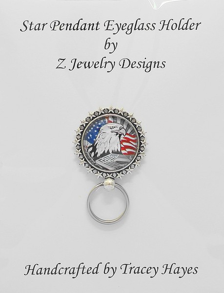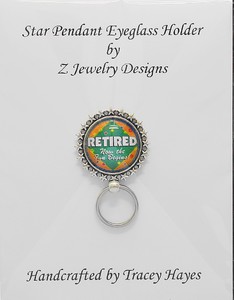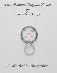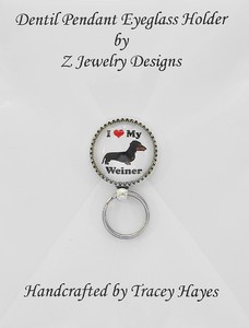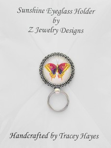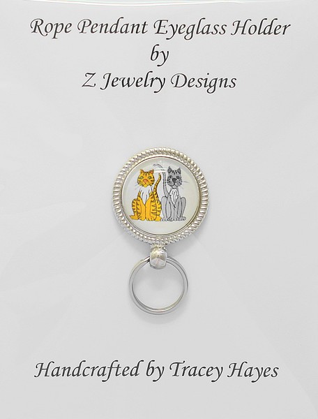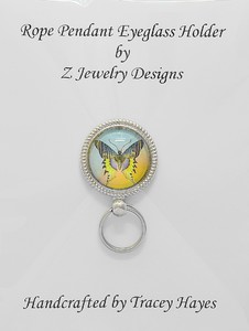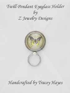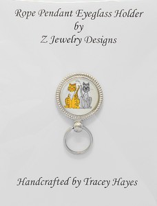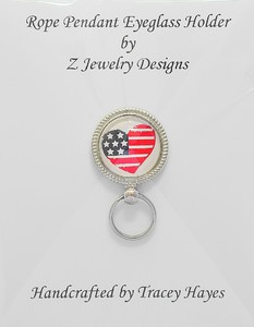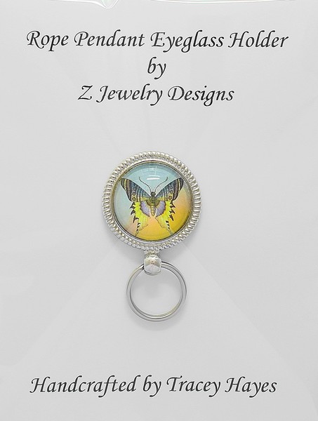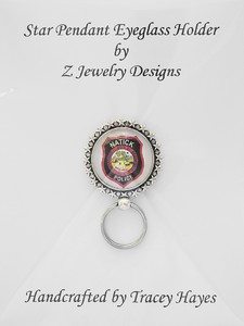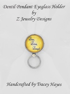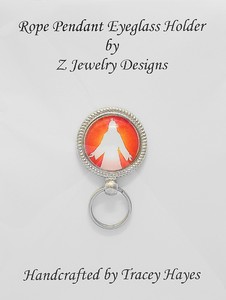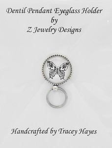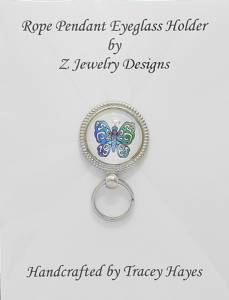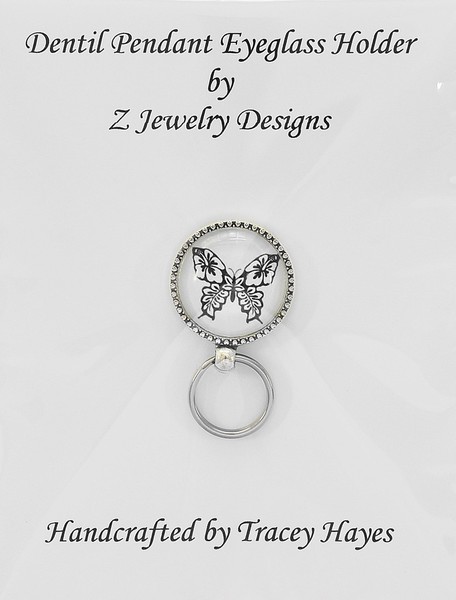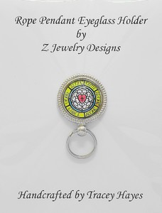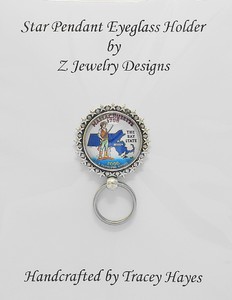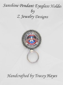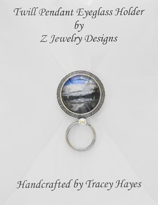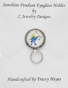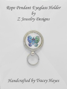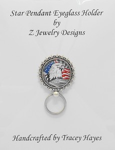 Each eyeglass holder consists of a pendant adorned with a stainless steel ring. Backed with a strong neodymium magnet intended to attract a even stronger magnet, the eyeglass holder stays in place while holding a pair of glasses. Industrial grade glues are used to secure the components. These are great for daily use of readers or as an accessory to hold a pair of sunglasses. All eyeglass holders on this page costs $10.00 each.