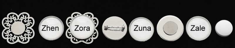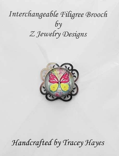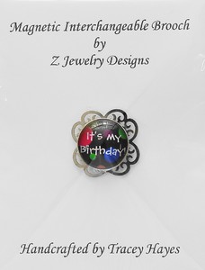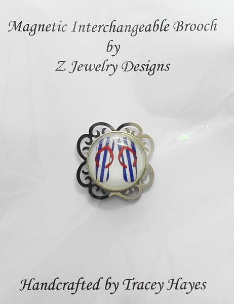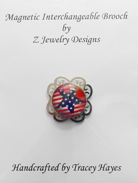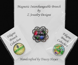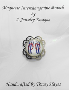 This stainless steel filigree brooch has two neodymium magnets; one on the front side to attract a metal-backed simple bezel and the other on the backside to attract a strong neodymium magnet that is used under one's clothing. All magnets are secured with an industrial glue. Simple cabochons (Zang) may be purchased separately so you can change out images and use this brooch in various applications. This interchangeable brooch costs $10.00.