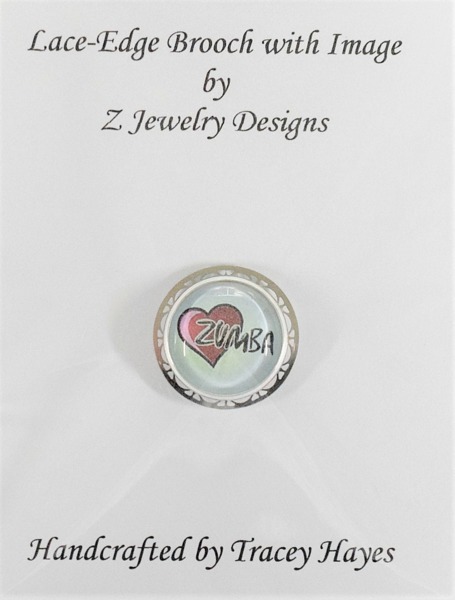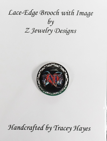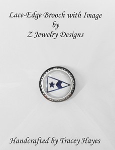 This brooch has a lace-edge stainless steel plate to add a bit of decoration to a simple pin. The cost of this brooch is $8.00.