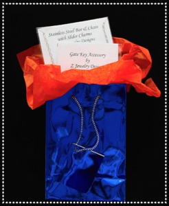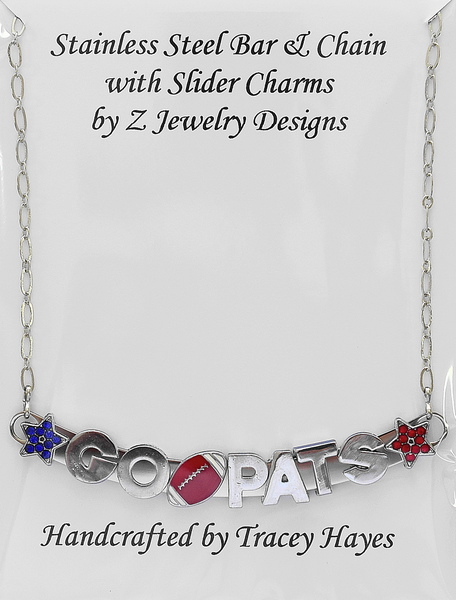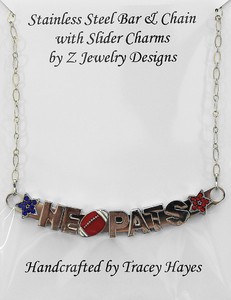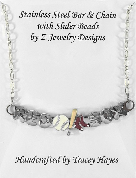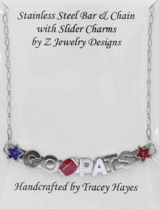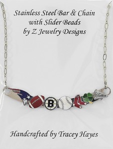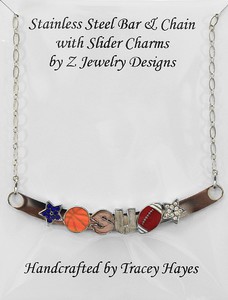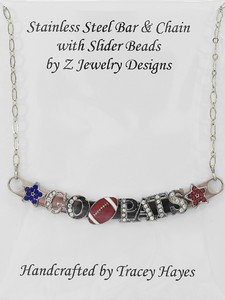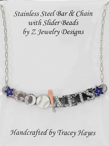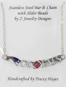 The stainless steel necklace has a stainless steel bar to hold up to 9 letters and/or symbols. Choose up to 6 slider beads to