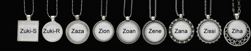 These pendants are adorned with stainless steel chains in various lengths. See the Price List for actual sizes. Each style necklace on this page costs $7.00.
