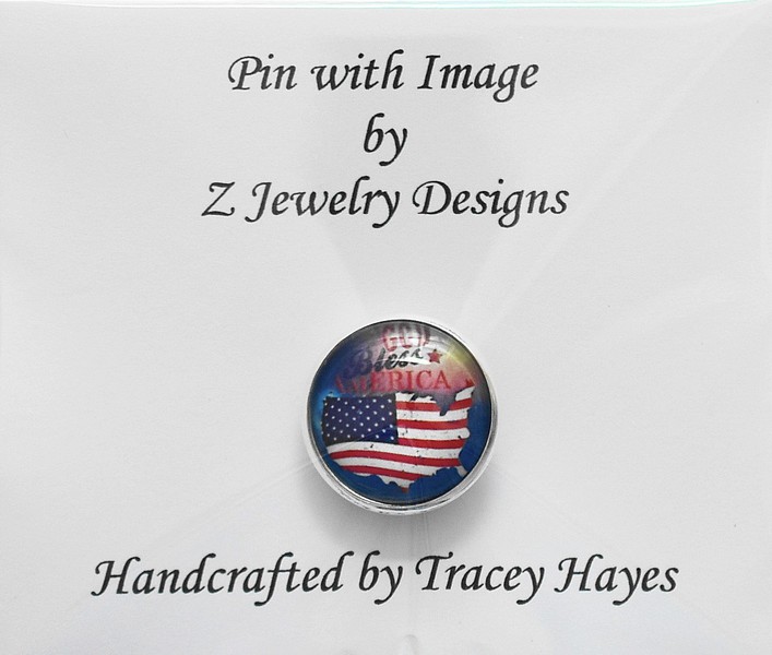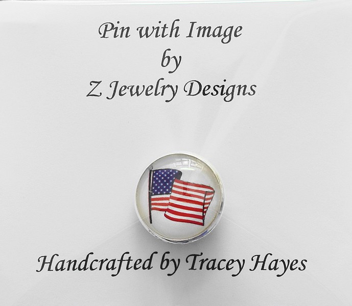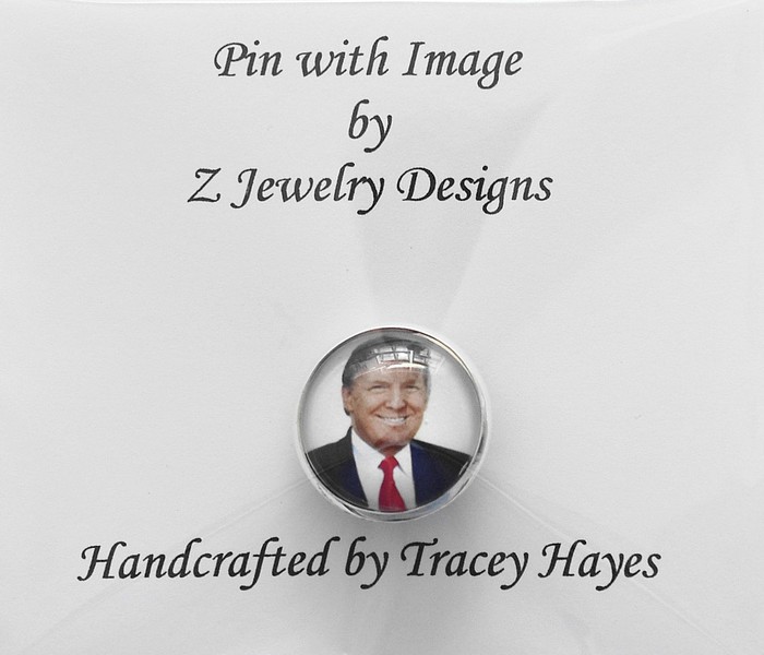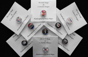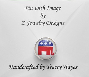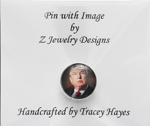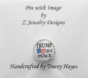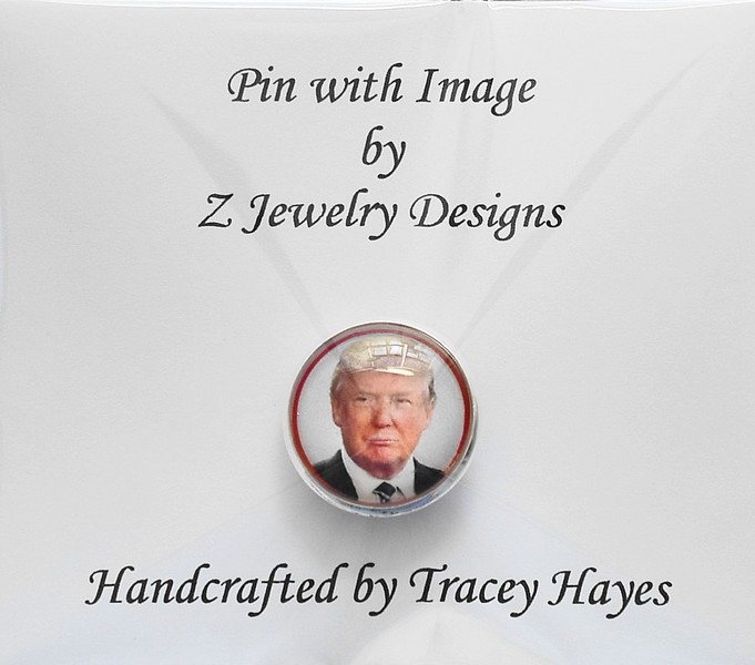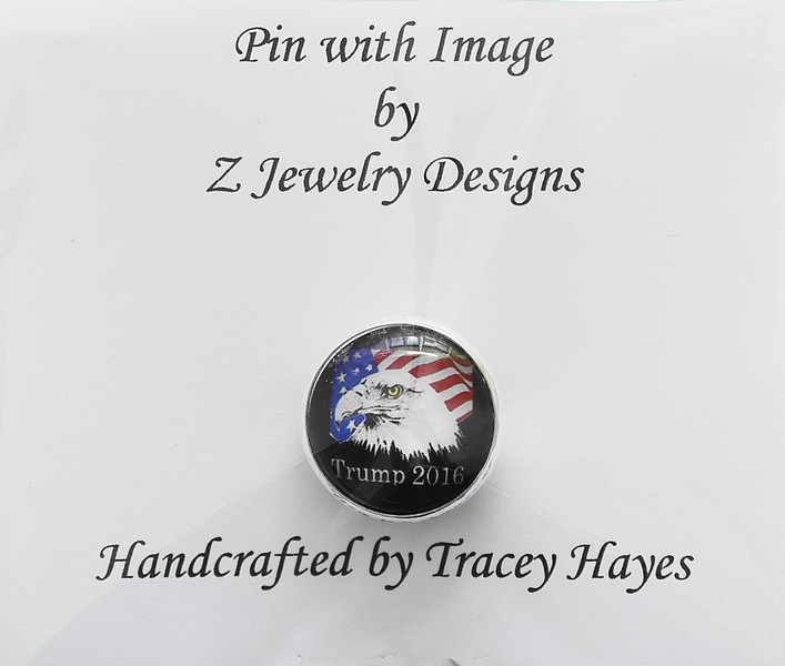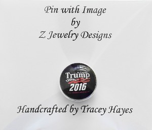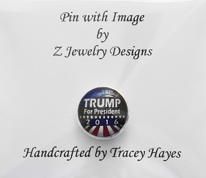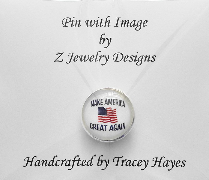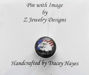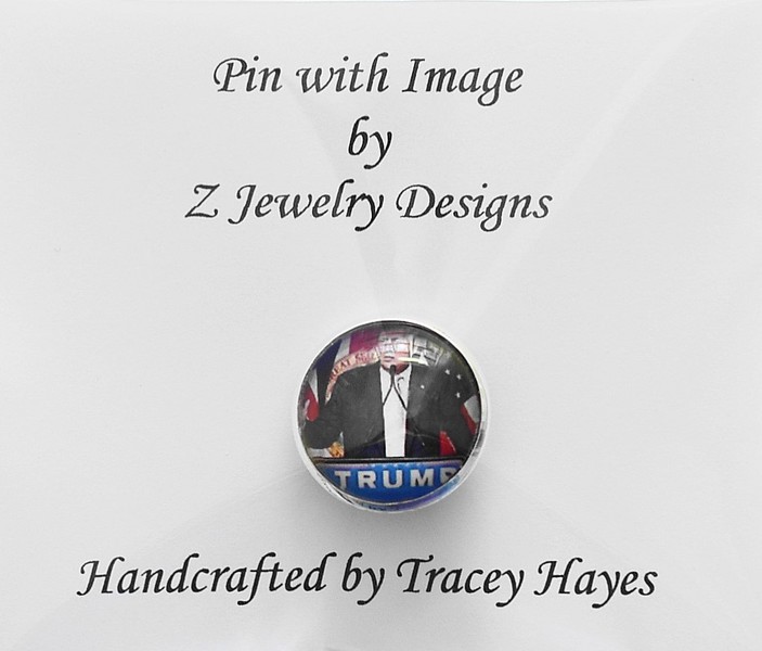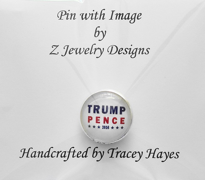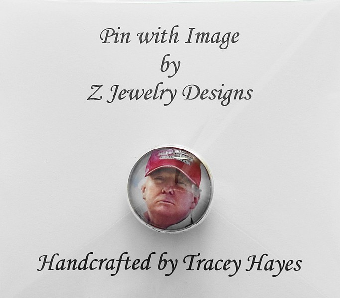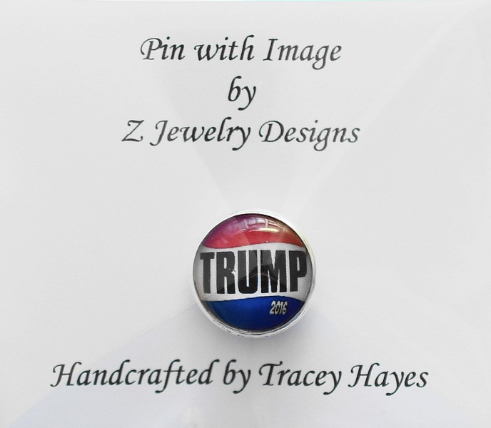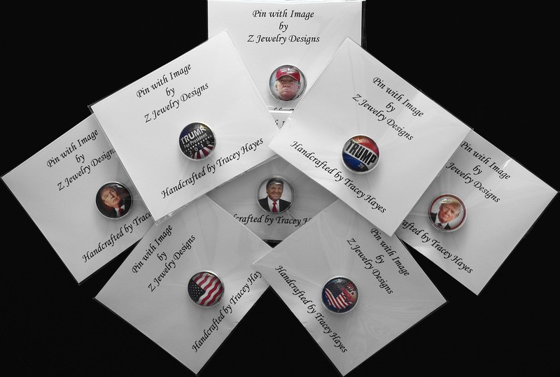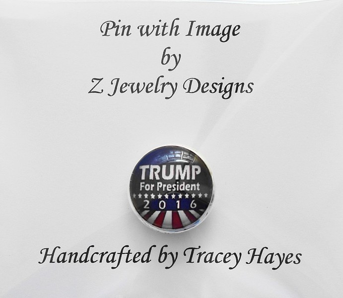 These pins were made for a Republican club promoting the GOP and Trump for President. The costs of each pin is $4.00. Any image or message can go under a glass cabochon so an organization can make the pin unique to their cause.