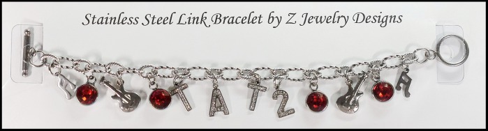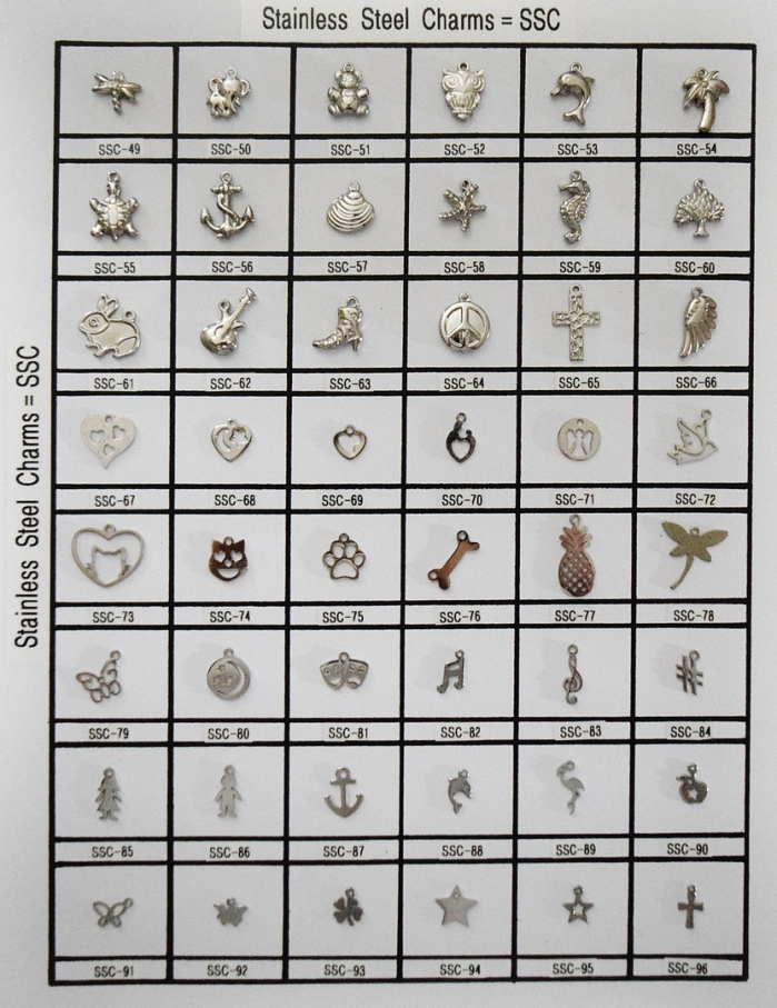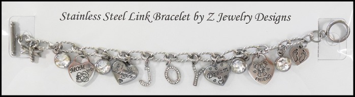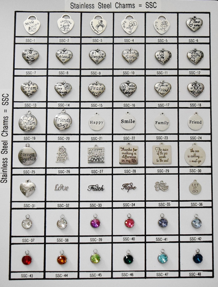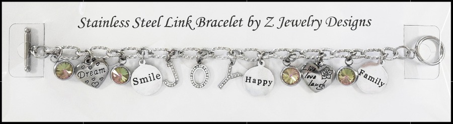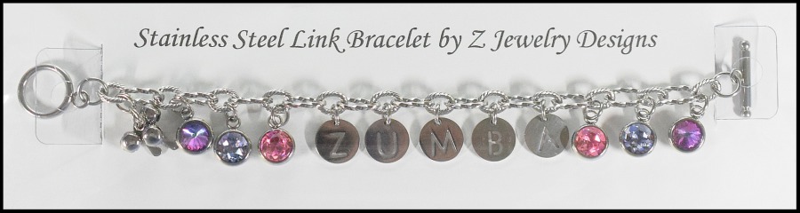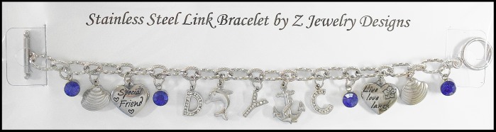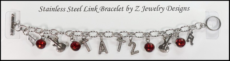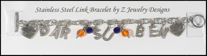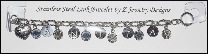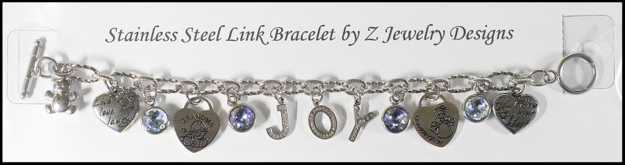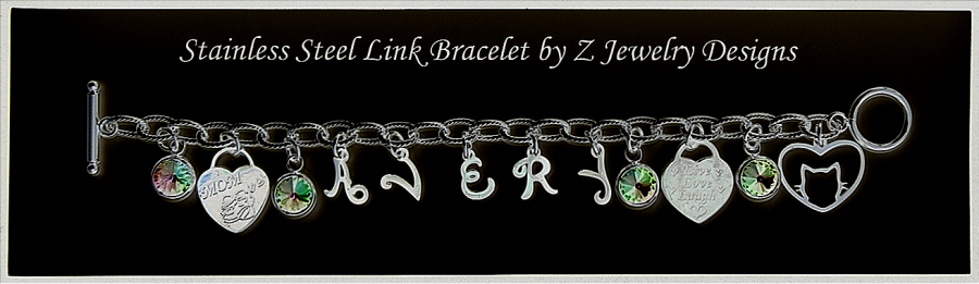 The stainless steel link bracelet costs $8.00. Add letters to spell out a name. (Limited supply in letters with a one-month lead time to order ones not in stock.) (+$1.00 per "round" pewter or stainless steel letter) (+$1.00 per stainless steel charm or crystal drop - availability varies) (+$1.50 per stainless steel/rhinestone letter) (.50 cents per stainless steel bell)