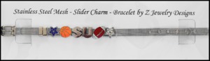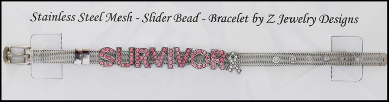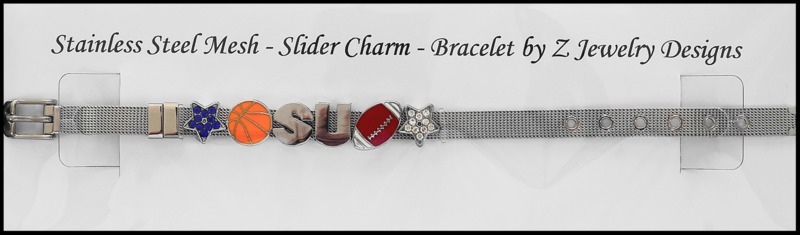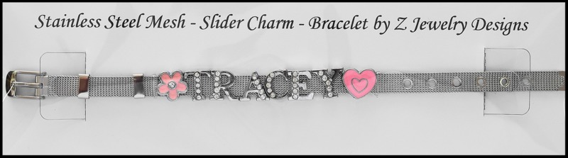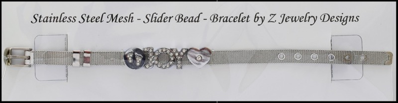 Stainless steel mesh bracelet with up to 6 slider beads is sleek in appearance. The cost is $7.00. Each additional slider bead cost 50 cents. Large slider beads cost $1.00 each.