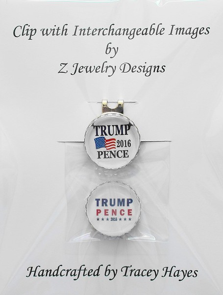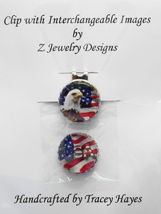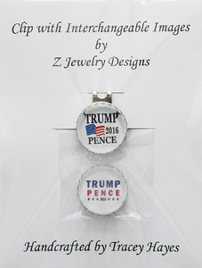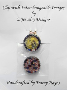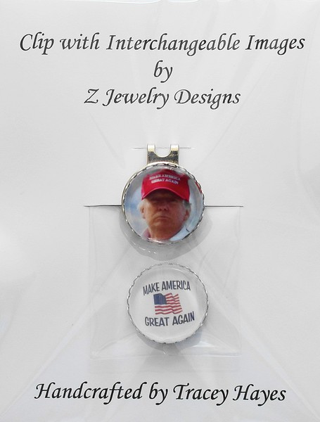 The one-piece clip is sturdy. It has a strong magnet to attract a metal disc which is attached to the backside of a lace-edge bezel. The raised flat glass cabochon magnifies the image making this accessory very versatile. It can be attached to a visor as well as a pair of sneakers to add a bit of decoration to one's attire. A set of interchangeable images costs $9.00.